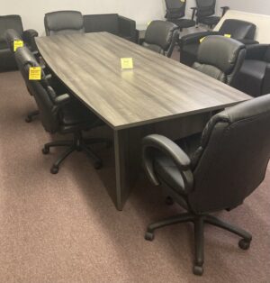 Buro- Boardroom Table ( boat shaped) with V base 108” L x 42”w x 29”h.